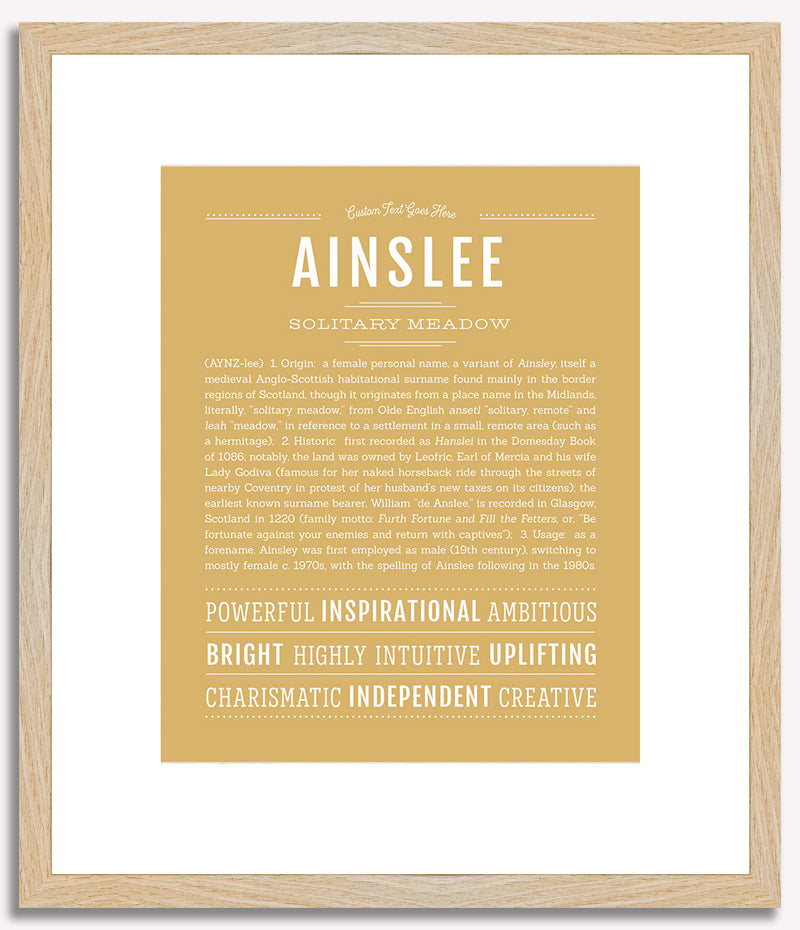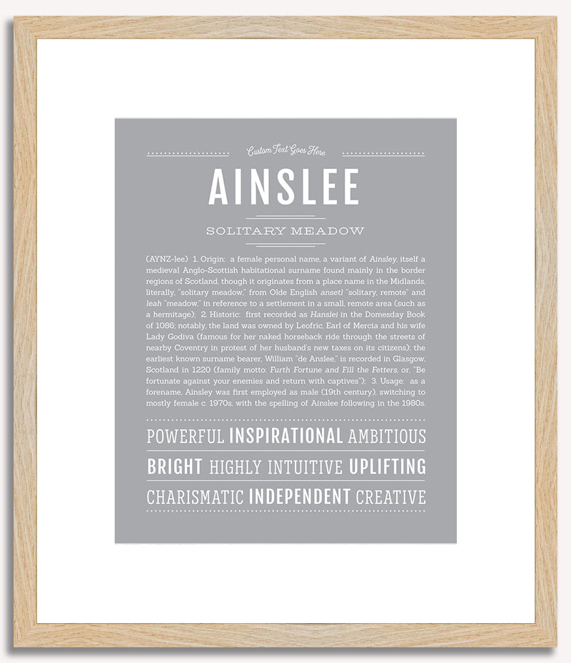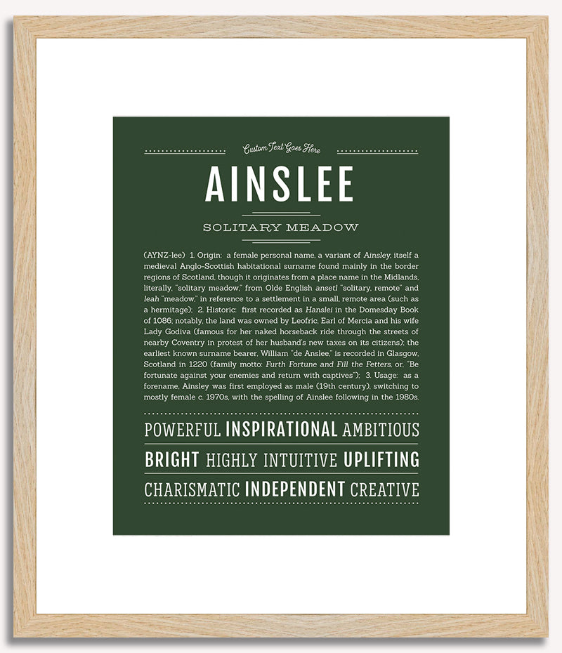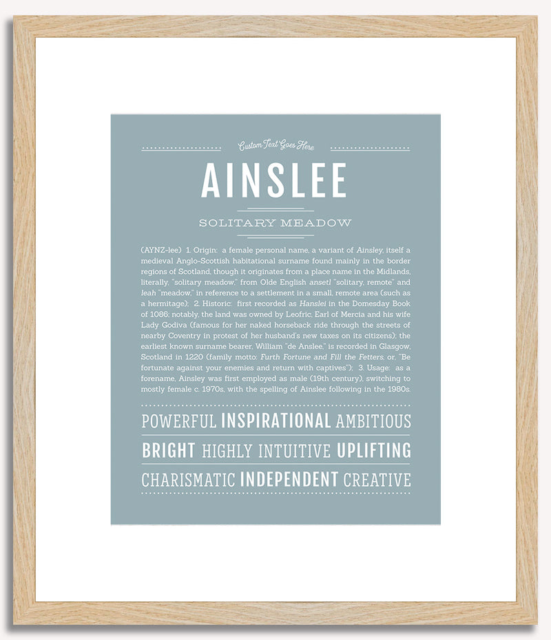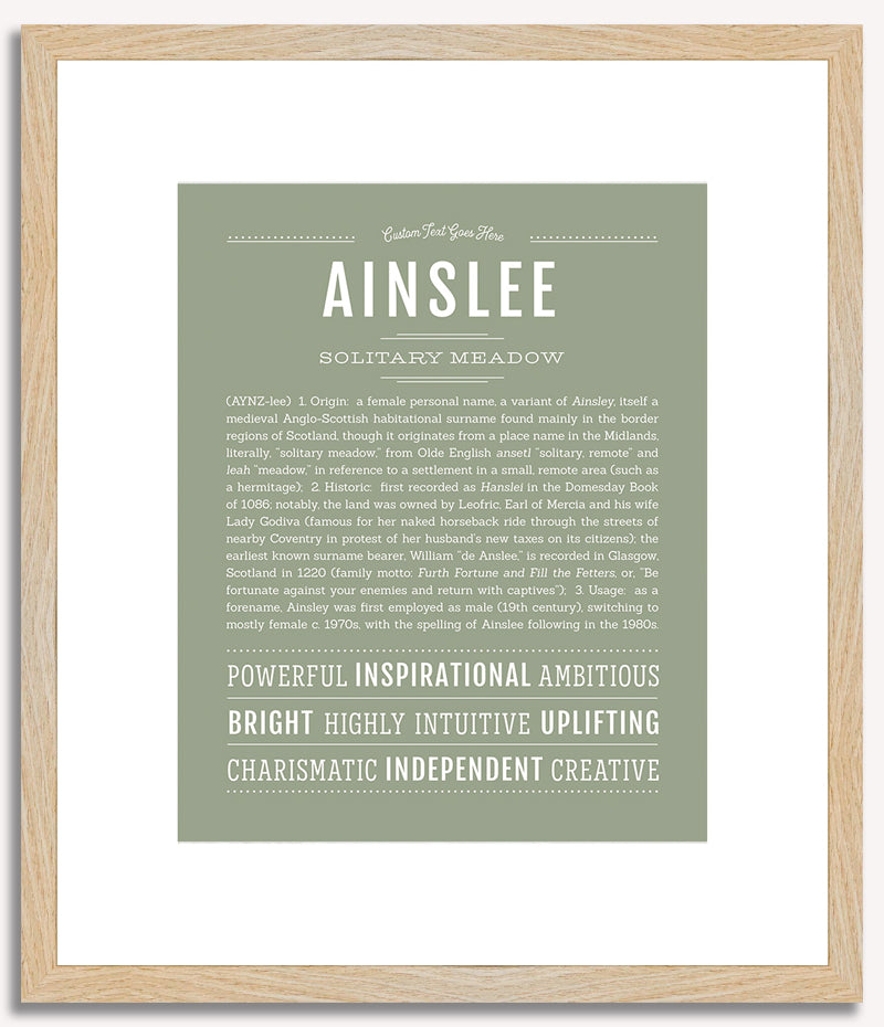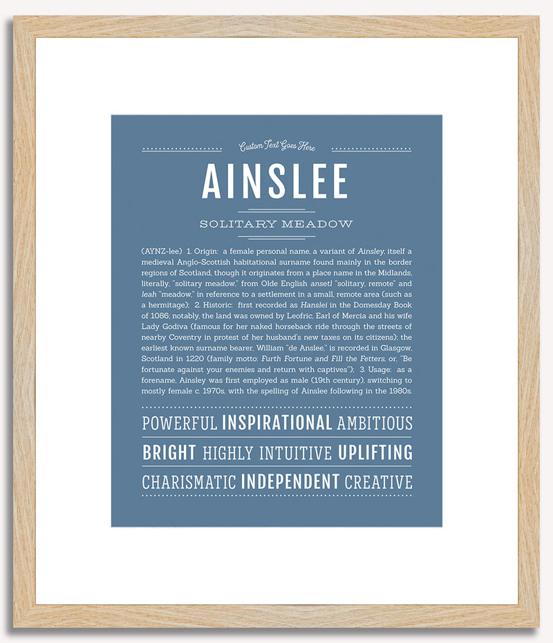 Names Stories® is not only a timeless keepsake of Ainslee’s name, but a thoughtful reminder of who Ainslee is: today, tomorrow, and always.