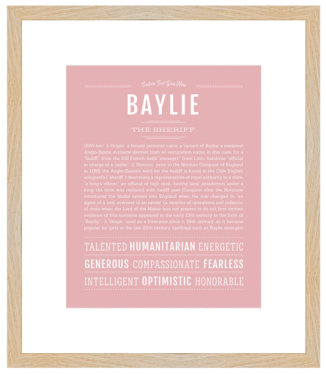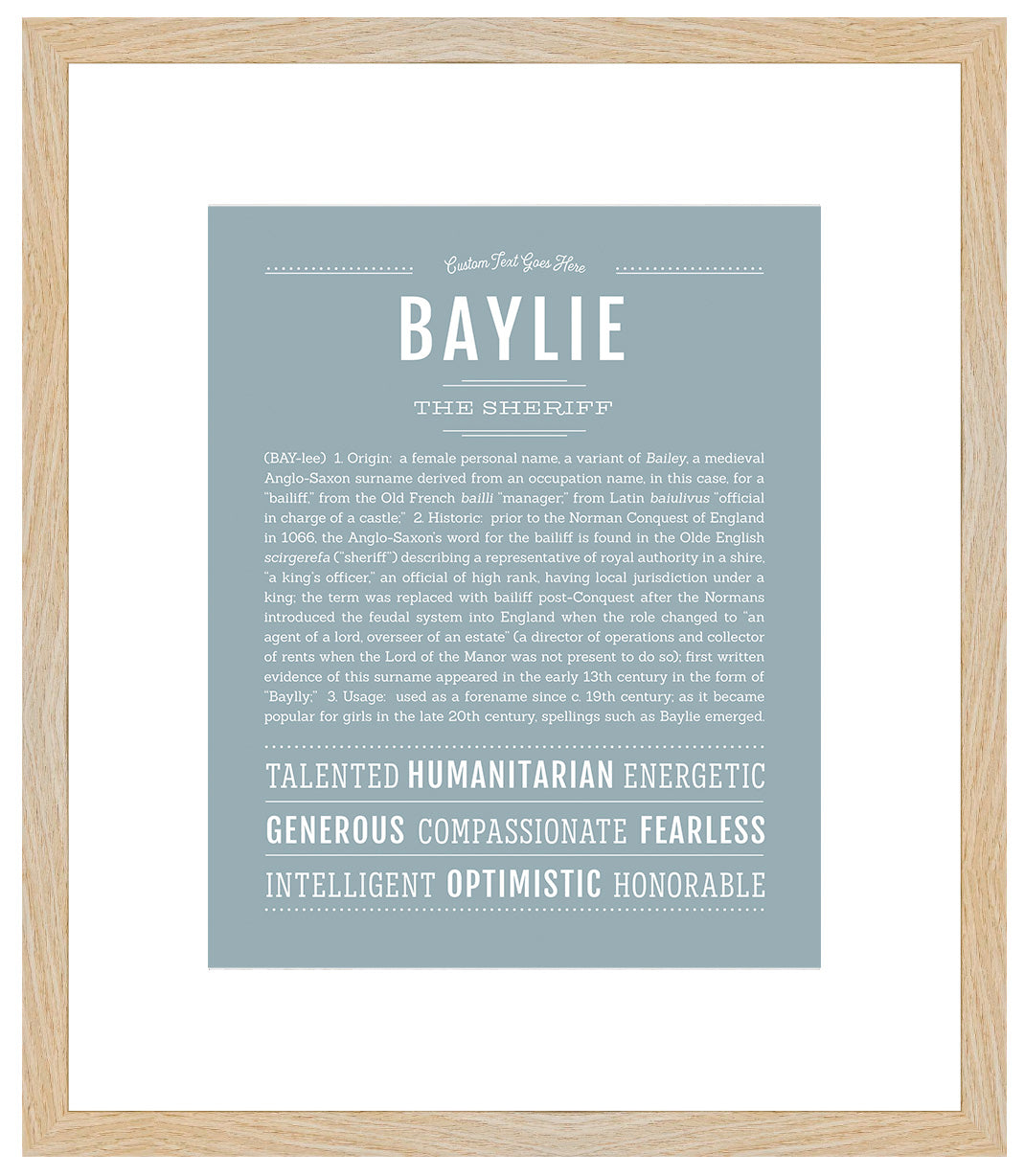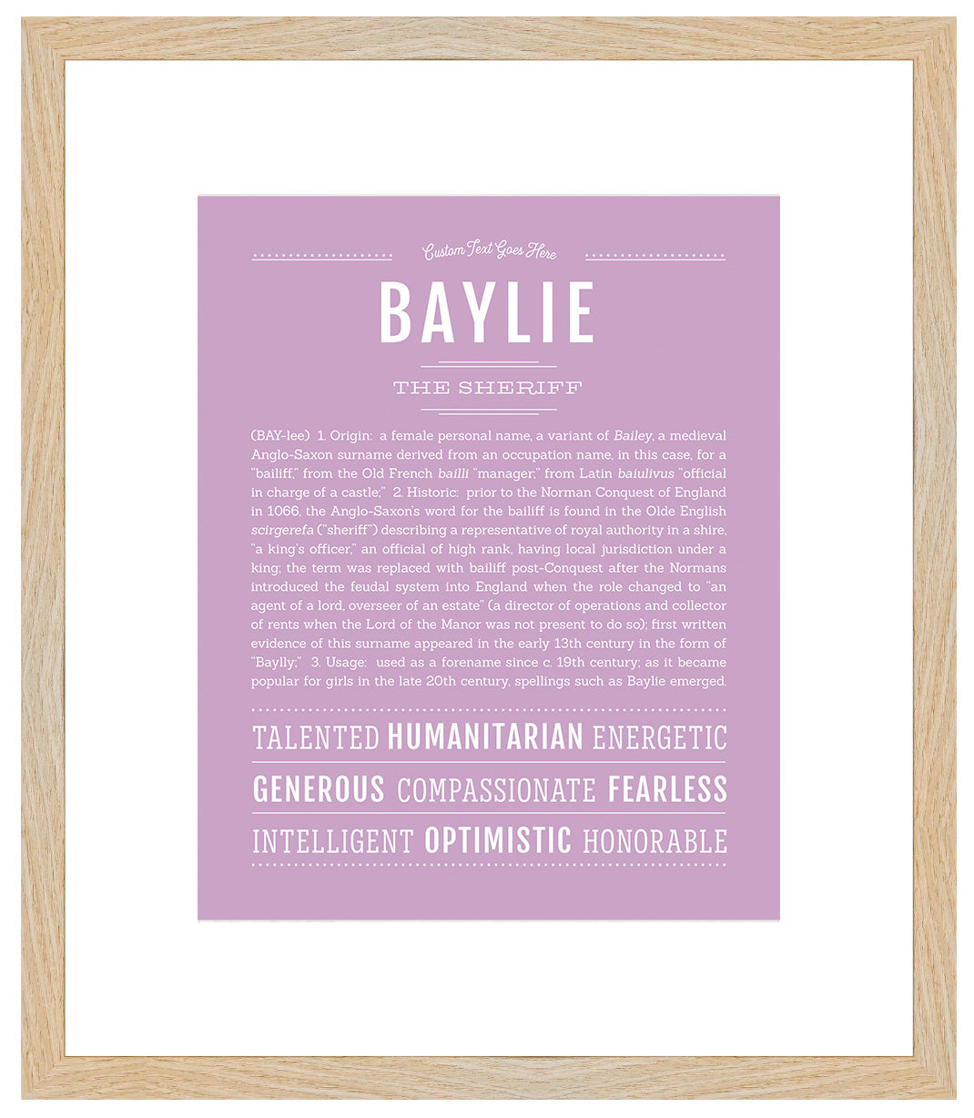 Your art print can be personalized by adding custom text above the name.