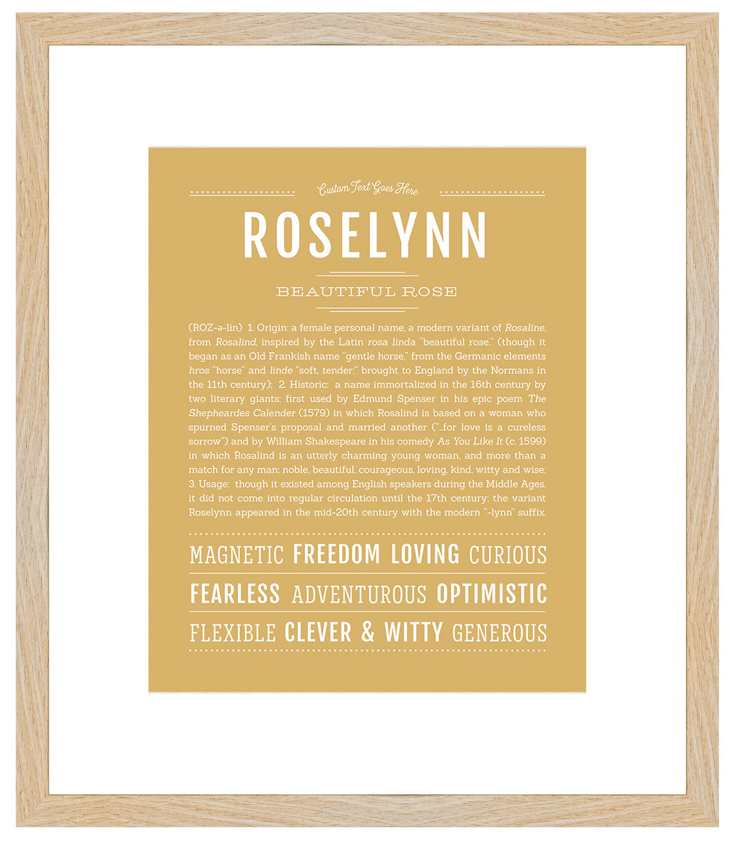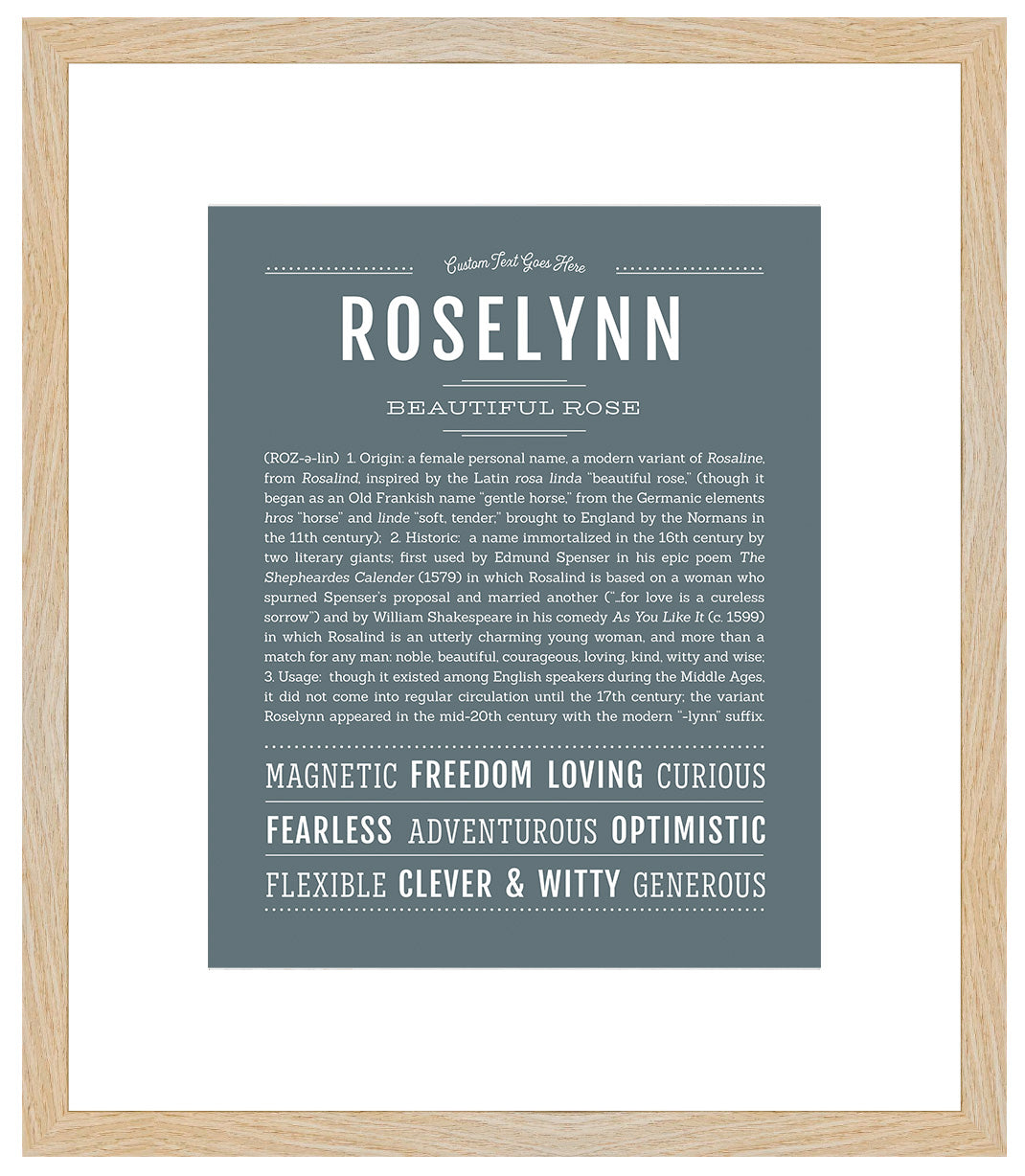 Your art print can be personalized by adding custom text above the name.